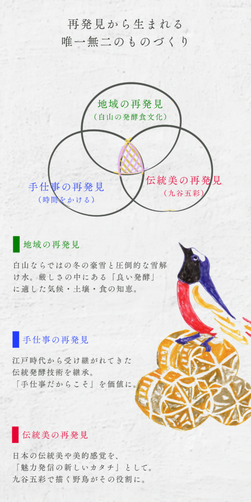 白山の自然が凝縮された米と発酵の力を信じて、「ゆっくり待つこと」を大切にしています。